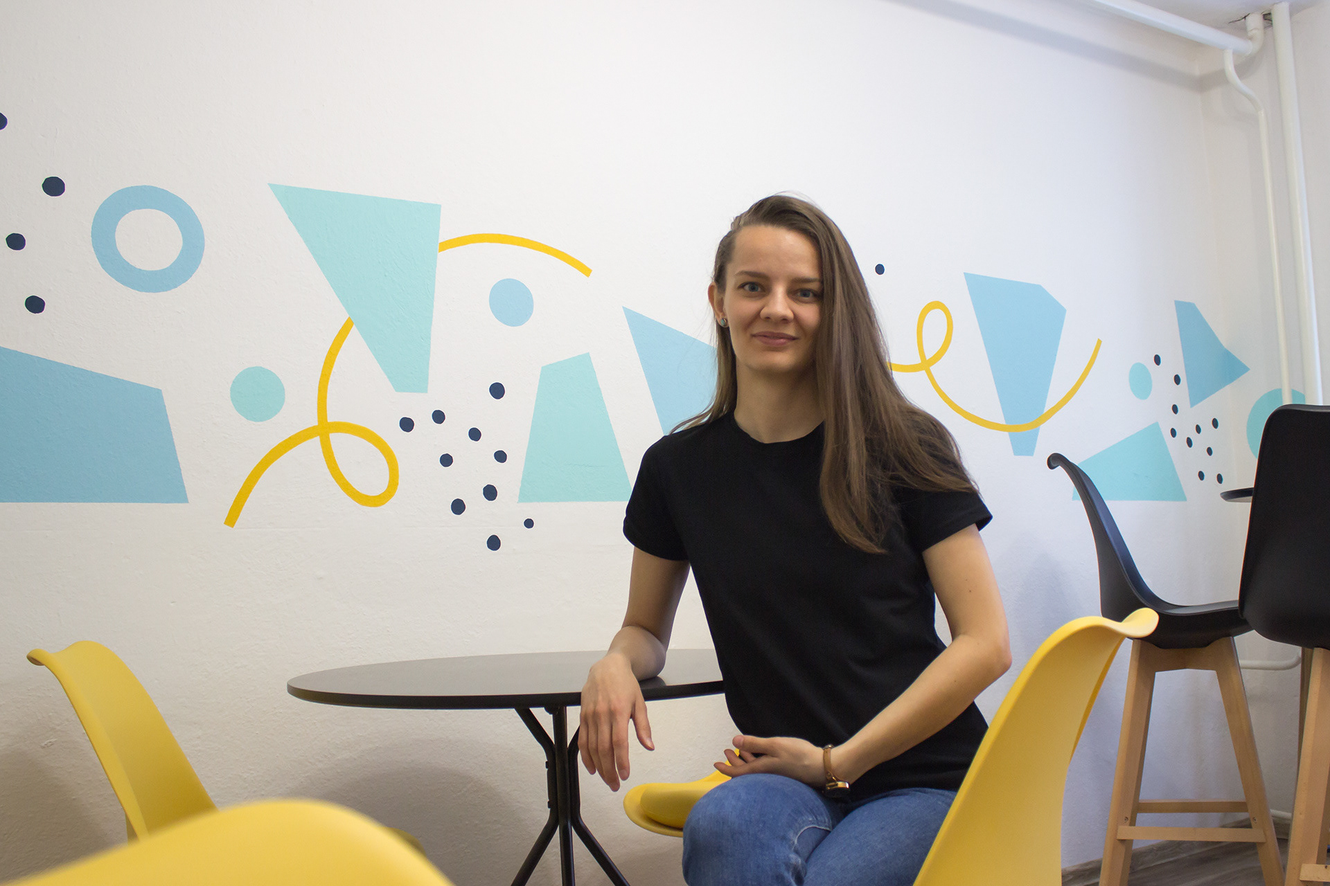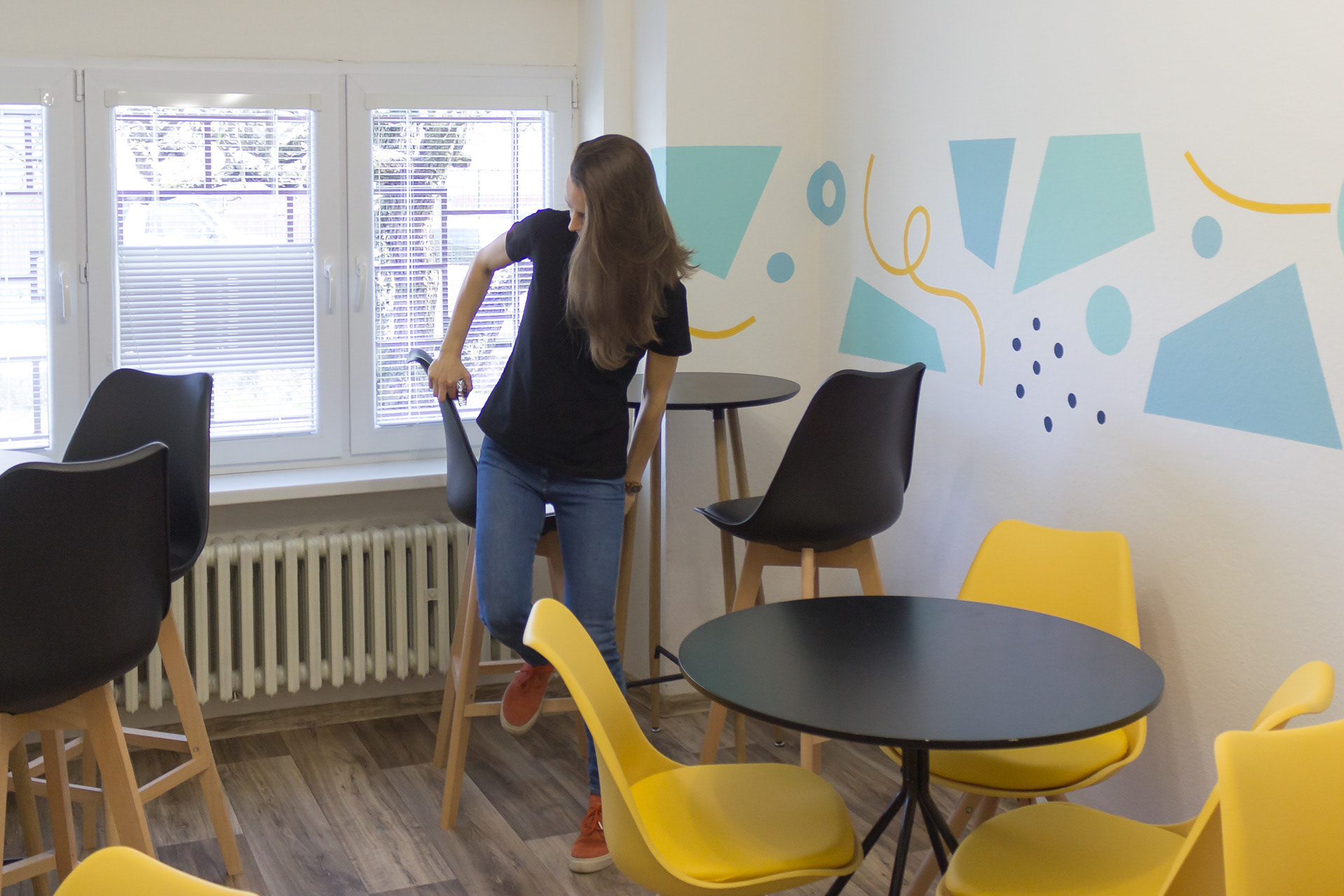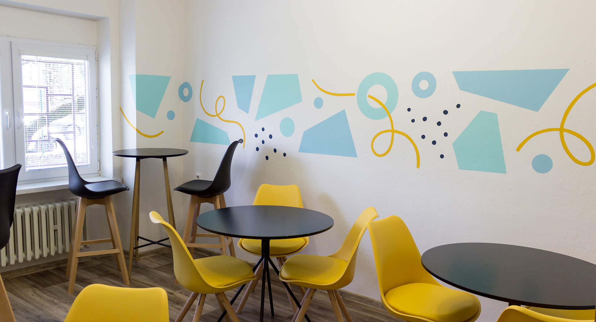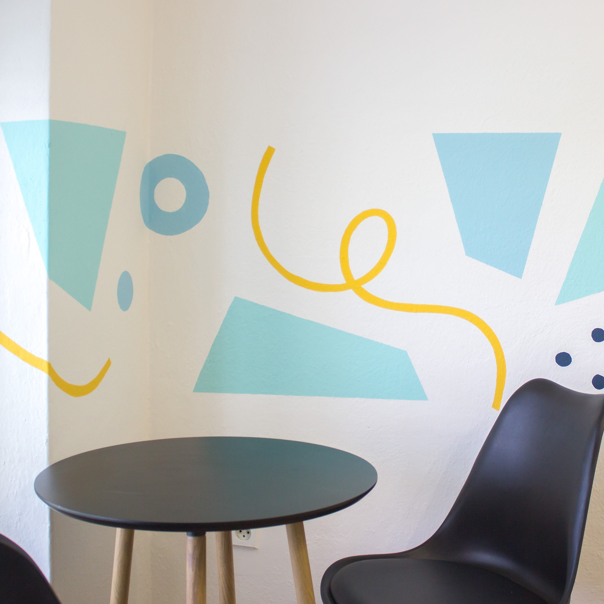Maľba vedie obvodom celej miestnosti a kombinuje v sebe geometrické prvky. Hranaté prvky dávajú maľbe štruktúru - určujú horný a dolný okraj. Oblé prvky ju zjemňujú a prepájajú. Celkovo spolu tvoria dynamickú rovnováhu.