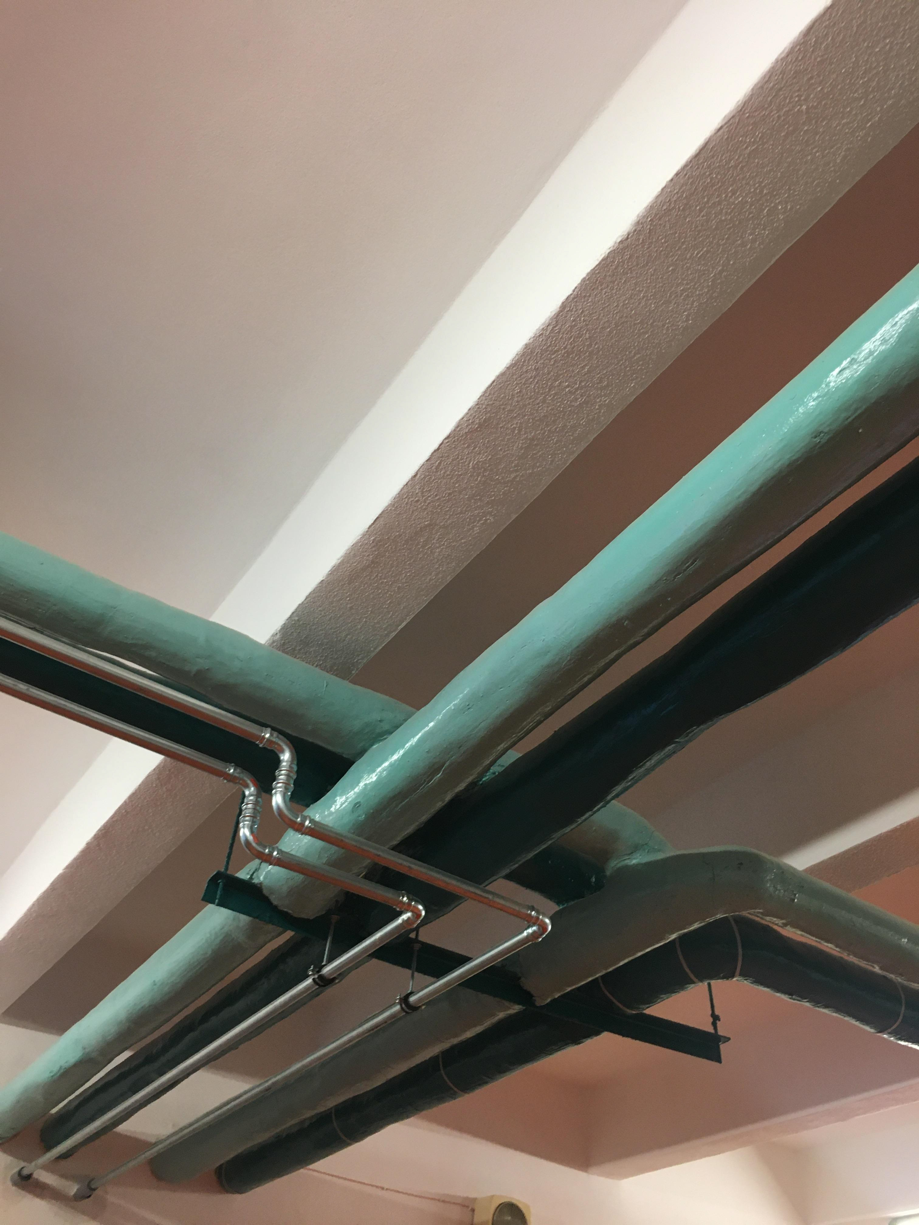 Inšpirácia pre maľbu prišlia priamo z miesta činu. Popri strope vedú rúry, ktoré majú zaujímavé odtiene zelenej. Farby aj motív boli zakomponované do návrhu, spolu s ďalšími detailmi, ktoré oživujú celkový výraz maľby. Spolu s novým nábytkom takto prepájajú a zjednocujú celú chodbu.