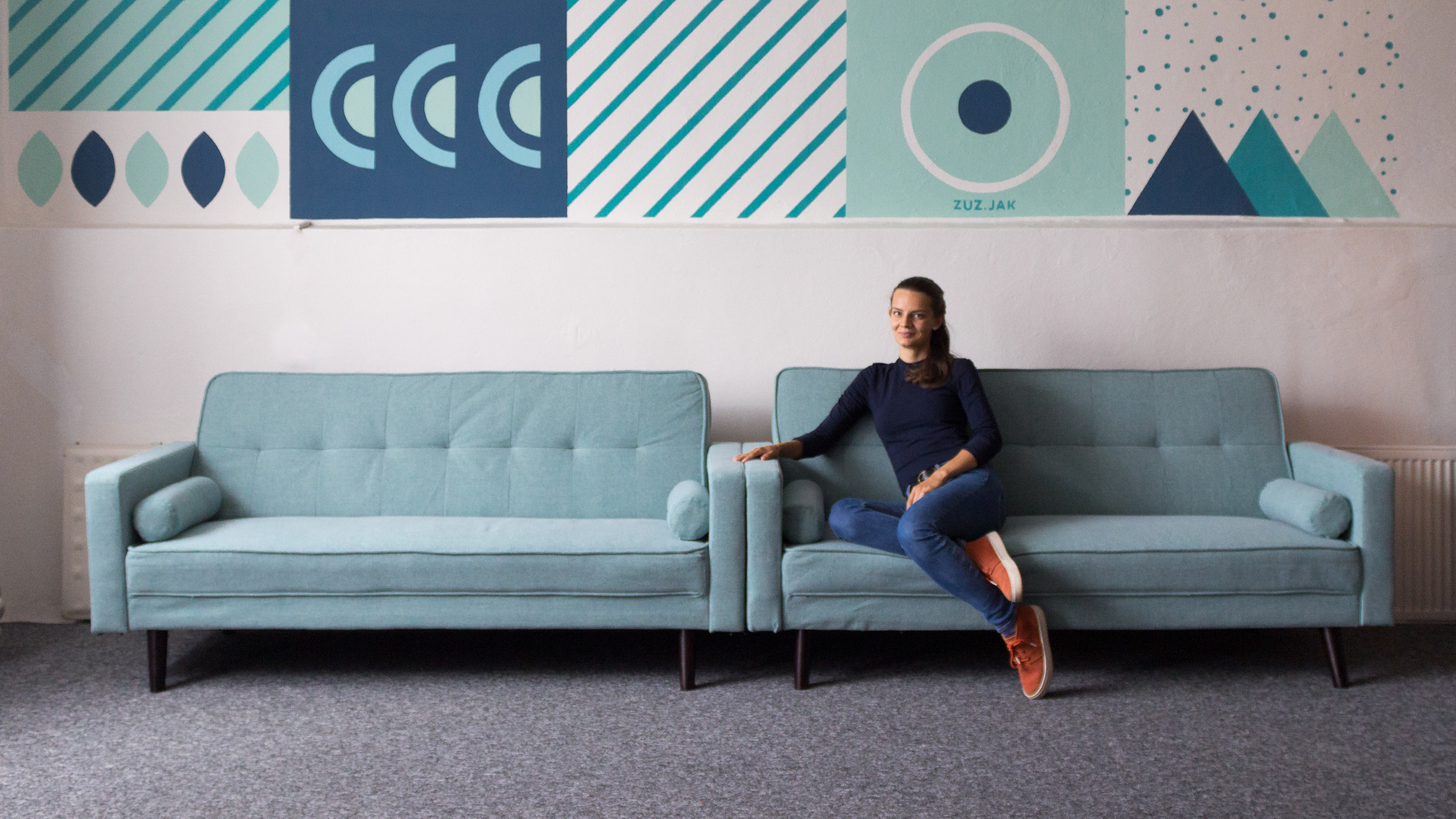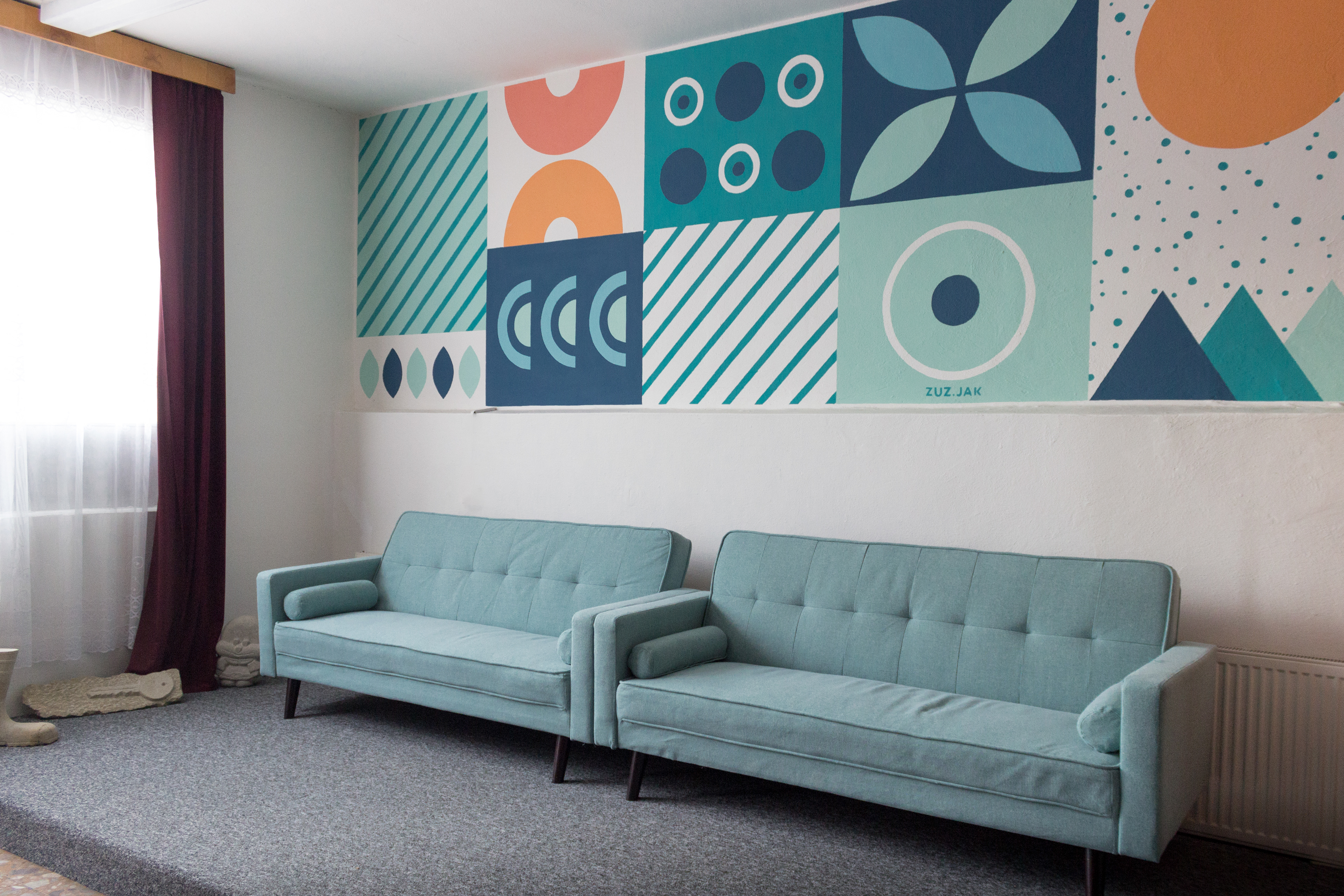 Táto spoločenská miestnosť slúži na stretávanie sa a dokáže usadiť až okolo 60 ľudí. V jej zadnej časti som vytvorila modernú geometrickú maľbu, ktorá oživuje a rozjasňuje interiér.